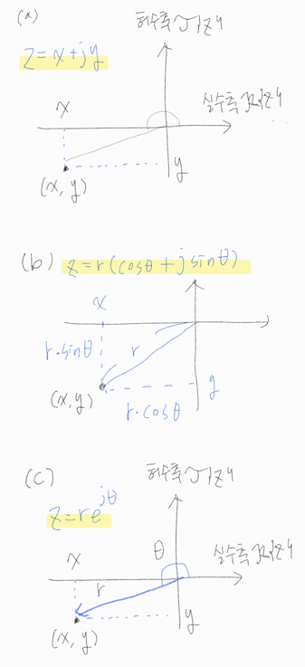 다음 그림 (b)로 넘어가 보자. 우리는 삼각함수 공식을 통해 x =r(sin θ), y=r(cos θ) 임을 알 수 있다. 이 수식을 정리해 보면 z = r(cos θ + j sin θ) 임을 알 수 있다.