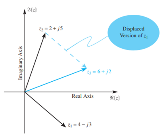두 복소수를 더할 때는 데카르트 폼(Cartesian form)을 이용해 보자. 만약 $$z_1 = x_1+jy_1$$이고 $$z_2 = x_2 +jy_2$$이면, $$z_3 = z_1+z_2 = (x_1+x_2)+j (y_1+y_2)$$이다. (즉, 실수는 실수끼리, 허수는 허수끼리 더한다.). 백터를 이용해 해석하면, 아래 그림과 같다.